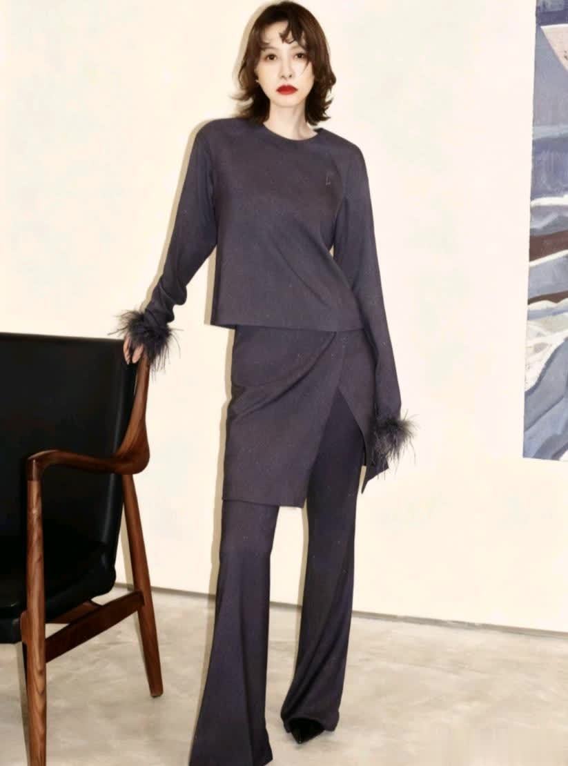 像上图中的这套高级灰套装,上衣的袖口做了羽毛装饰,增添了不少高级感;下身是一条假两件设计的微喇裤,又带着些许复古韵味。