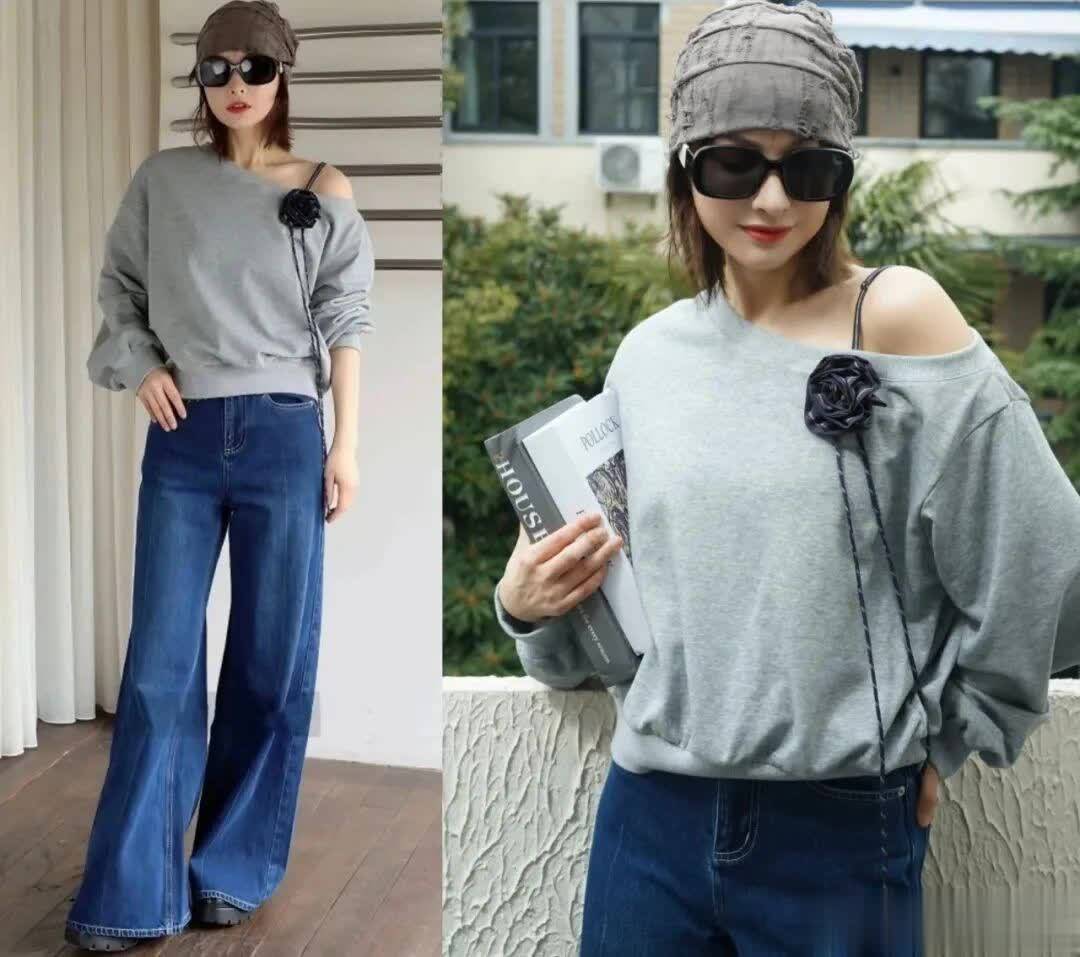 像吴昕的这套,就是穿了一件灰色的斜肩卫衣,斜肩处还设有肩带、黑玫瑰设计,增加了细节。