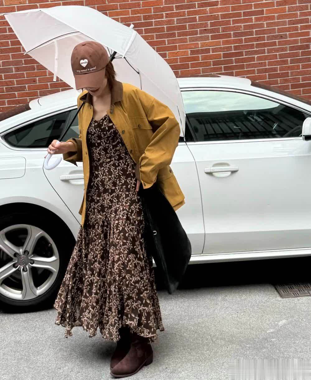 那么怎么让这条裙子更贴合秋季氛围呢?咱们只需要套上一件黄色的工装外套,再穿上和裙子底色同色的靴子,感觉立马就不一样了。