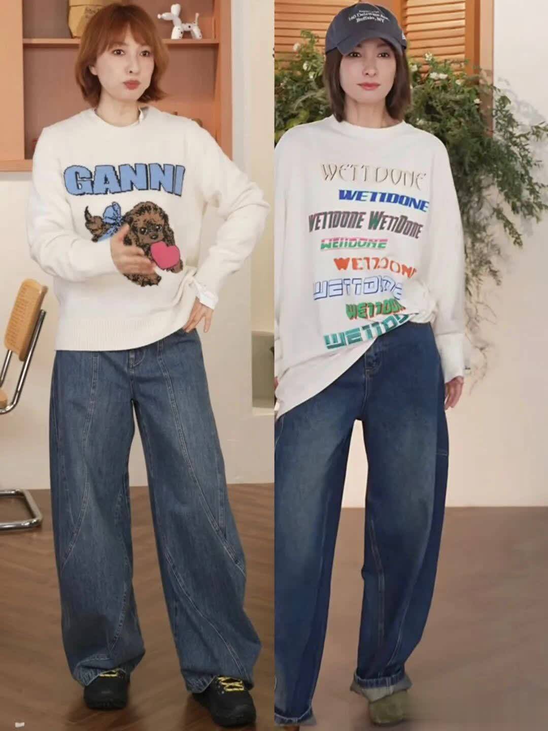 比如吴昕上图的这两套,都是用一件白色的文字图案卫衣,搭配了一条牛仔裤。