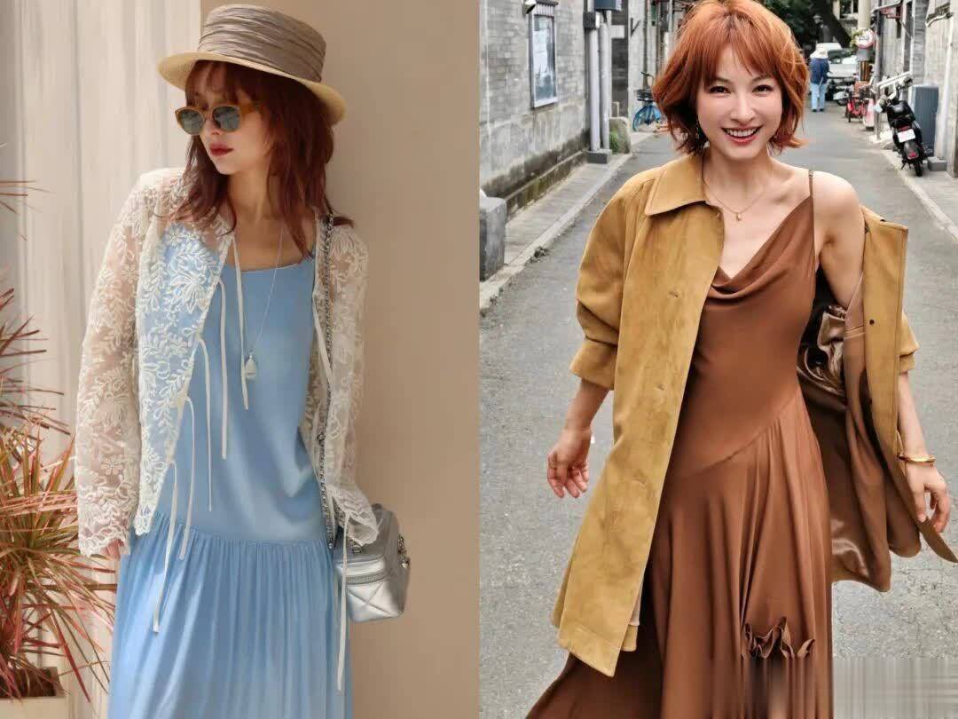 没有那么“花哨”的吊带裙,用纯色的来搭配也是很不错的。比如蓝色吊带裙+白色花朵镂空开衫、棕色吊带裙+卡其色衬衫,都让吴昕穿得很好看。