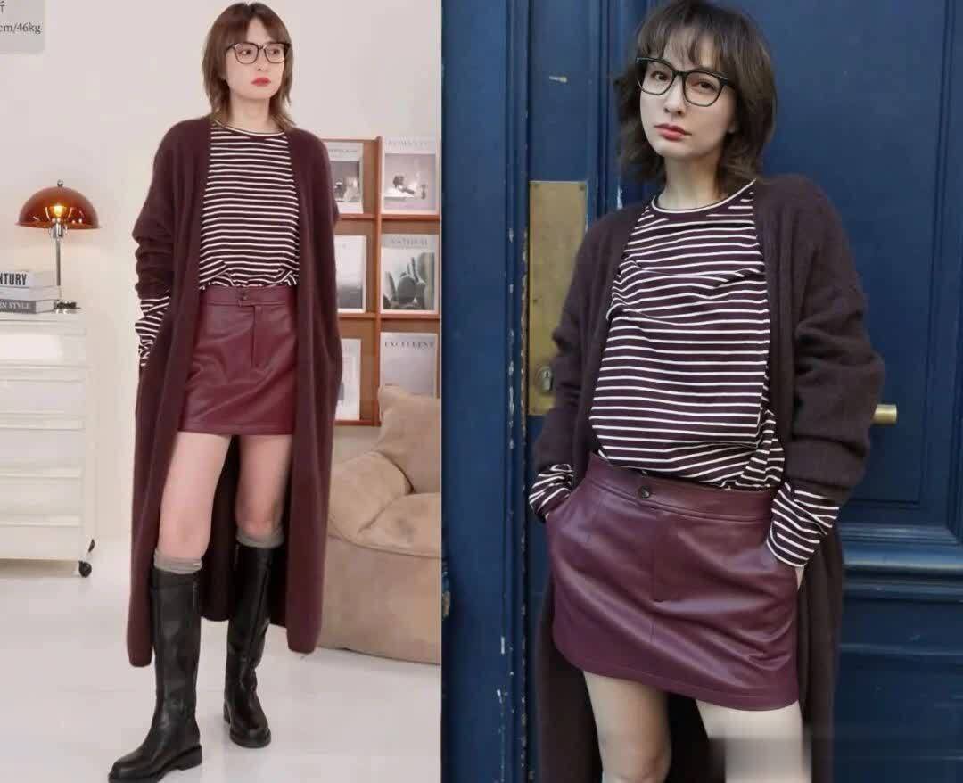 穿上一双黑色的直筒靴,露出了从大腿到膝盖的部分,最后叠穿上一件安可拉红的长款针织开衫,有女人味的同时还超时髦的。